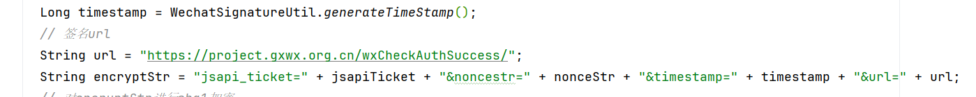 String encryptStr = "jsapi_ticket=" + jsapiTicket + "&noncestr=" + nonceStr + "×tamp=" + timestamp + "&url=" + url;