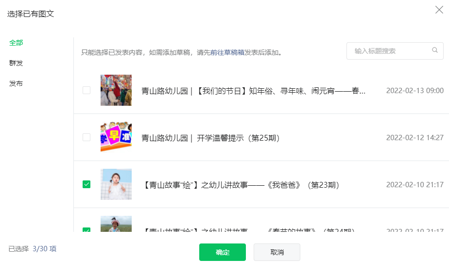 你好,目前只能添加已发布或者已群发。发布是不会发送给粉丝,也不会占用群发次数,目前每天可以发布多次。