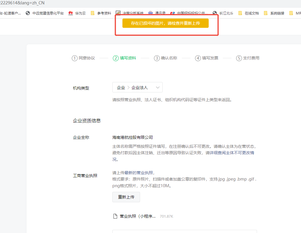 小程序提交年审,在完成填写资料后无法正常提交,报“存在已损坏的图片,请检查并更新上传”,如下图所示。