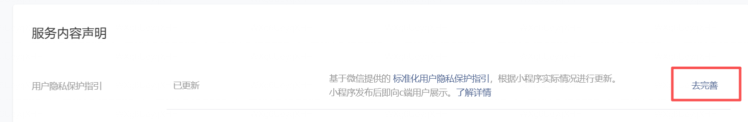 另外我也已经按照网络上说的方法设置了"用户隐私保护指引",通知中心也提示已经审核通过,但页面右边的按钮依然为“去完善”而不是“查看”。
