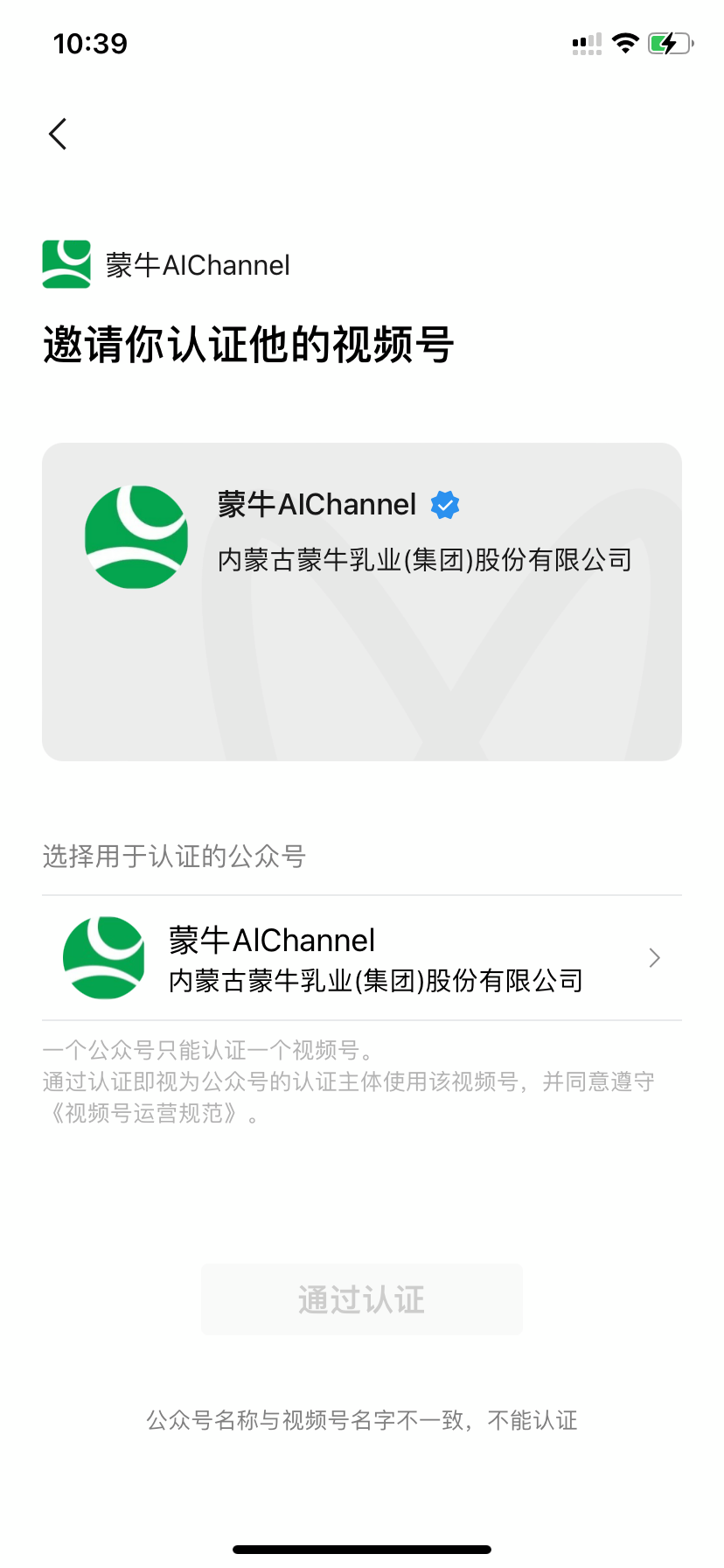 5. 问题描述:视频号进行公众号辅助认证时,显示名称不一致,实际上是一致的