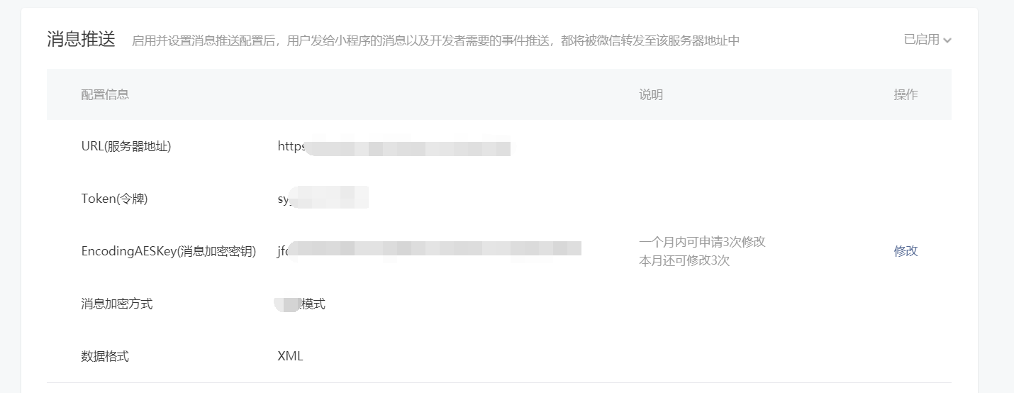 登录网页小程序后台,开发=》开发配置,消息推送中设置。