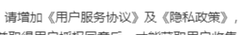 建议 这个页面 在提交按钮上面,增加 勾选 用户协议和隐私政策 的选项;类似于这样