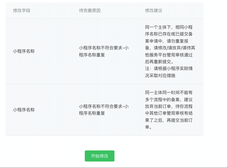 小程序管理员由于工作调动变更了新的人员,按照微信push消息要求进行“变更备案”,点击“变更备案”进入正常提交。初审通过后,复审说的重复提交了,已有备案信息了,找了微信客服无解,就说我已有备案信息,不能重复提交,但是明明不是你们叫我们变更备案的,重新提交的嘛?