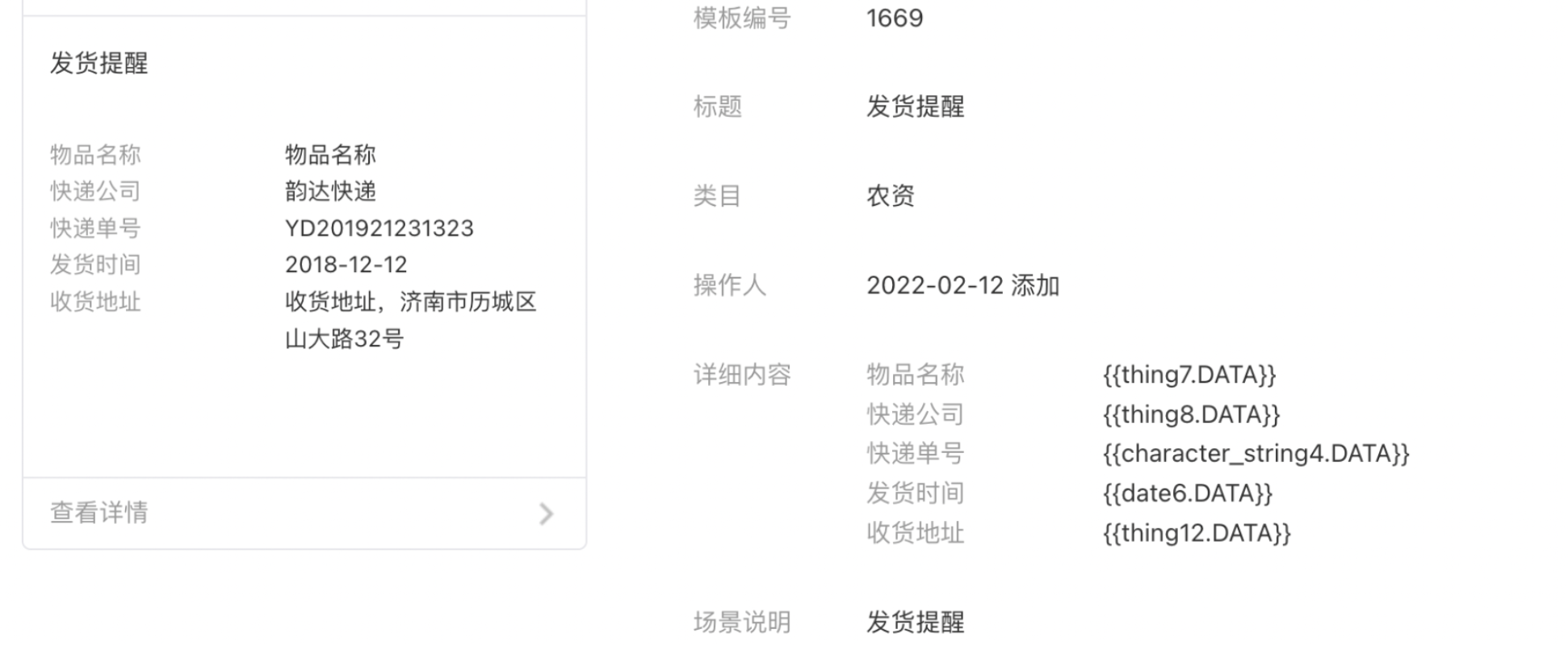 {"thing7":{"value":"西兰花"},"thing8":{"value":"顺丰"},"character_string4":{"value":"SF150383222222"},"date6":{"value":"2023-2-2"},