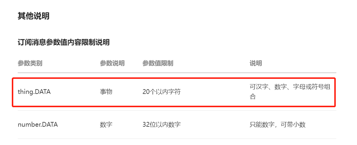 thing 限制20个以内字符,参考文档:https://developers.weixin.qq.com/miniprogram/dev/OpenApiDoc/mp-message-management/subscribe-message/sendMessage.html#%E5%85%B6%E4%BB%96%E8%AF%B4%E6%98%8E