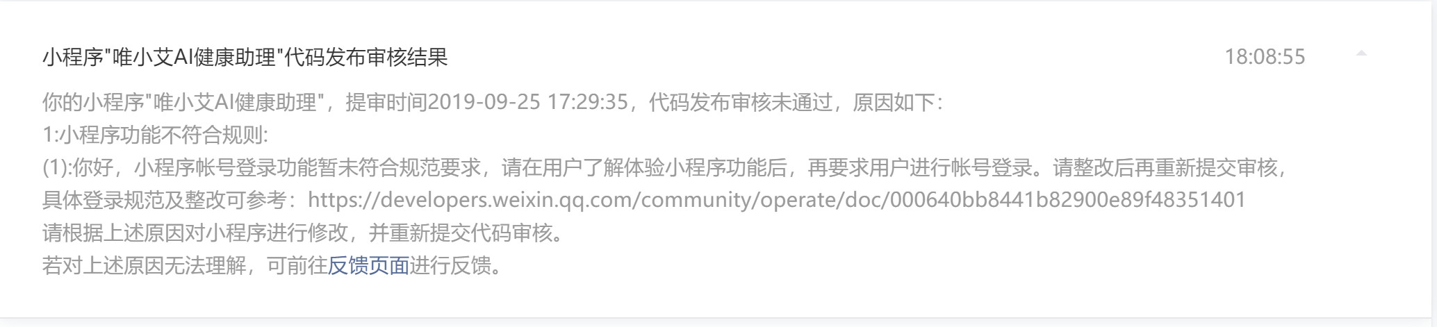 你好,经核实,贵方小程序最新提审版本登录功能符合登录规范,但功能无法体验,建议提供可登录体验的测试账号信息(如设备编号),填写在 版本描述处提交,以便审核人员及时体验到小程序功能。