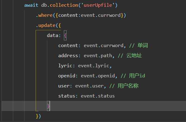 let data= { content:event.currvord,//单词 address:event.path,//云地址 lvric: event.lyric, openid:event.openid,//用户id user:event.user,//用户名称 status: event.status } console.log(data)//这里打印一下。 await db.collection(...).where(...).update({data})
