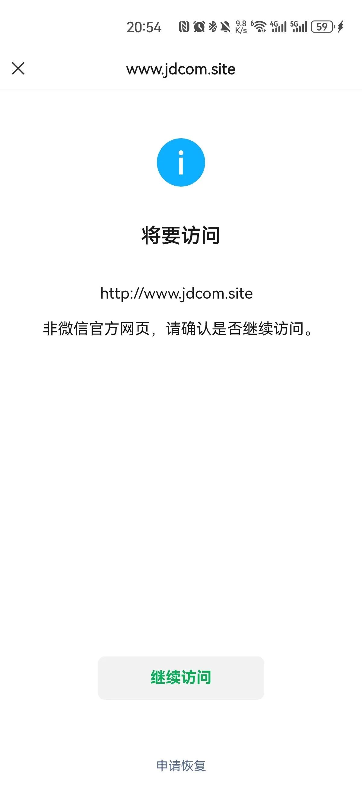 目前网站已经通过ICP备案,网站www.jdcom.site,域名jdcom.site,也没有违反微信管理规范,但在微信打开还是提醒如图非官方网页,很影响使用,帮我加下白名单,谢谢