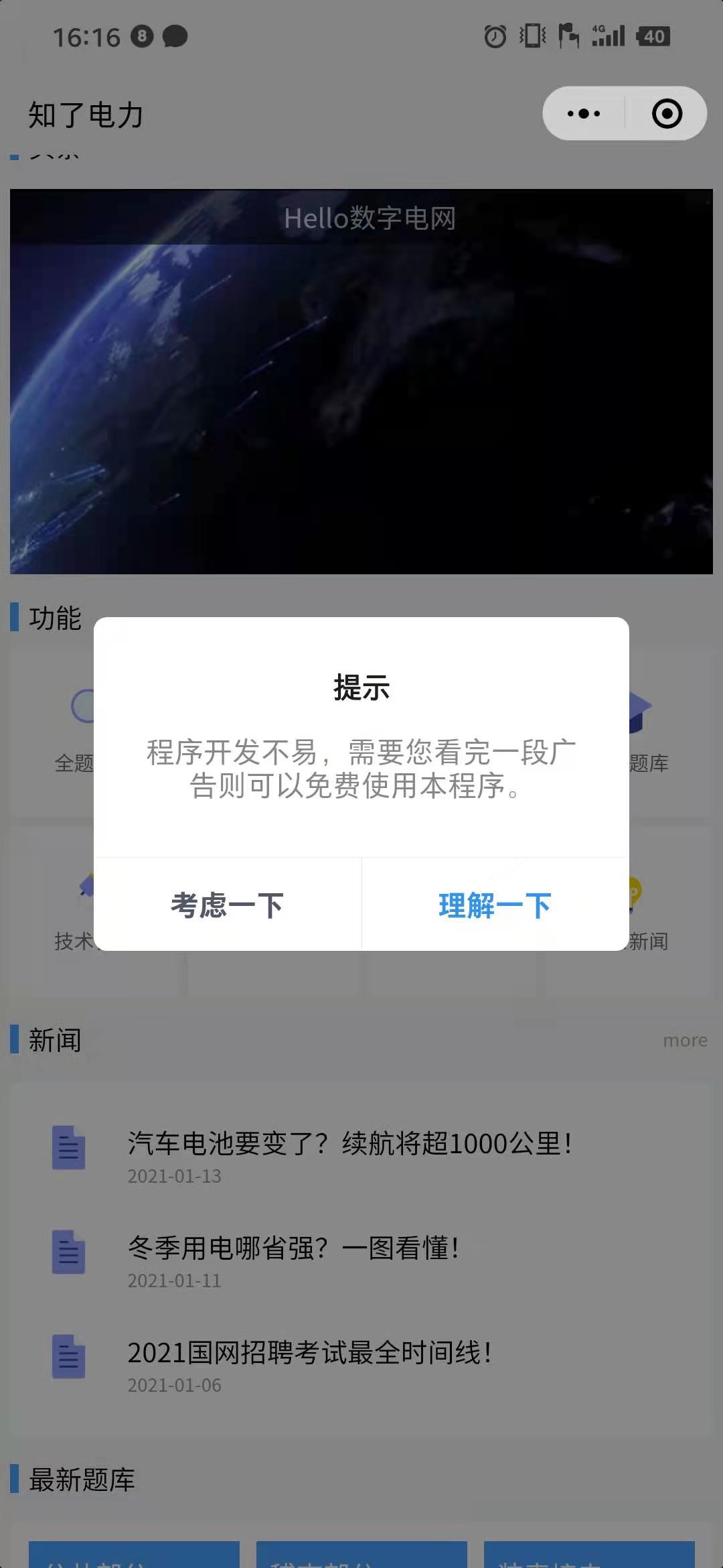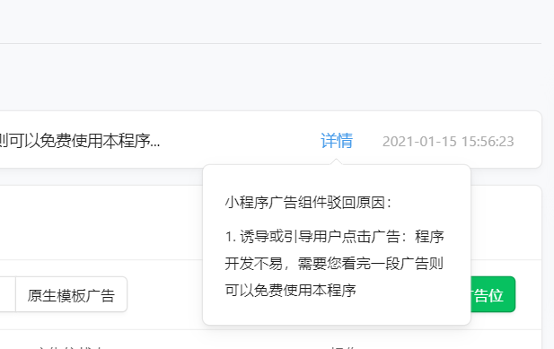 1、 提示改成看广告免费体验小程序 按钮改成放弃(返回首页,不允许使用) 、 继续
