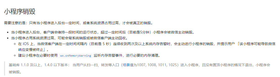 小程序销毁可以参考:https://developers.weixin.qq.com/miniprogram/dev/framework/operating-mechanism.html