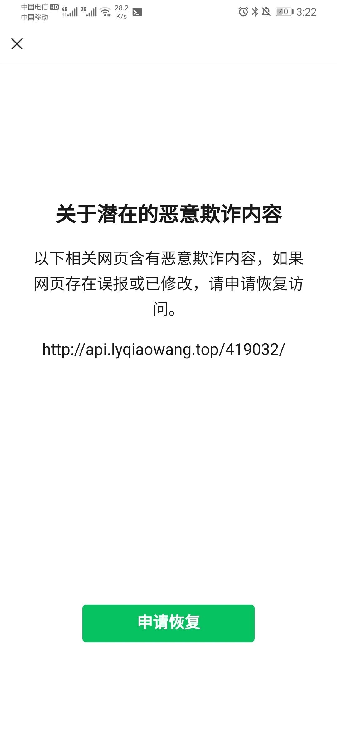 你好,经核实,域名lyqiaowang.top下的链接【http://api.lyqiaowang.top/419032/】的违规内容已经修改,现已恢复微信内直接访问的服务,请知悉。