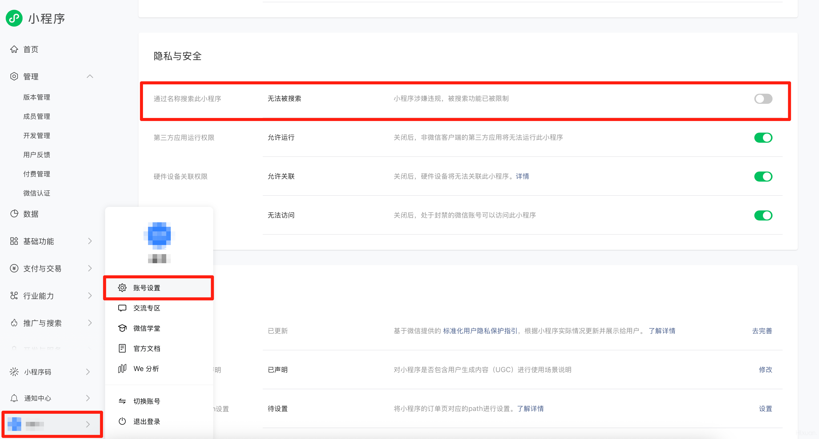 登录小程序后台——左下角头像——账号设置——隐私与安全——通过名称搜索此小程序,这里看下是否被禁用无法开启。