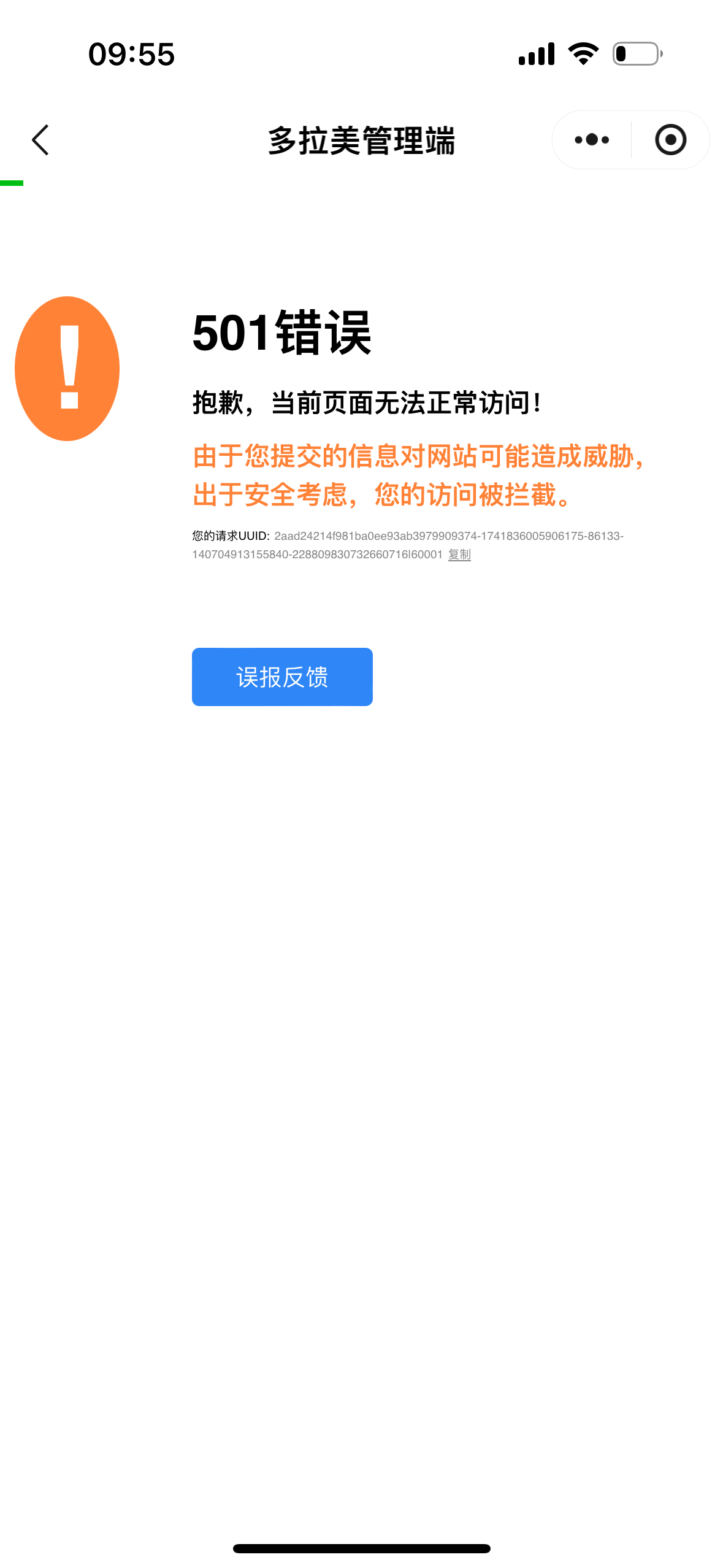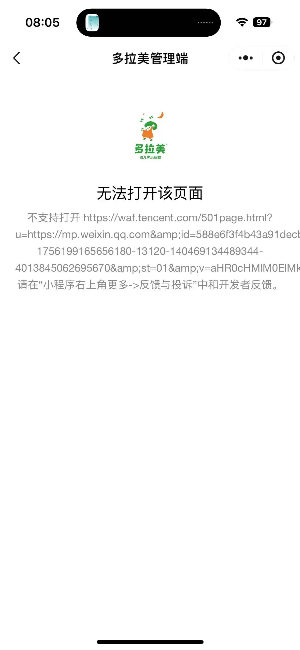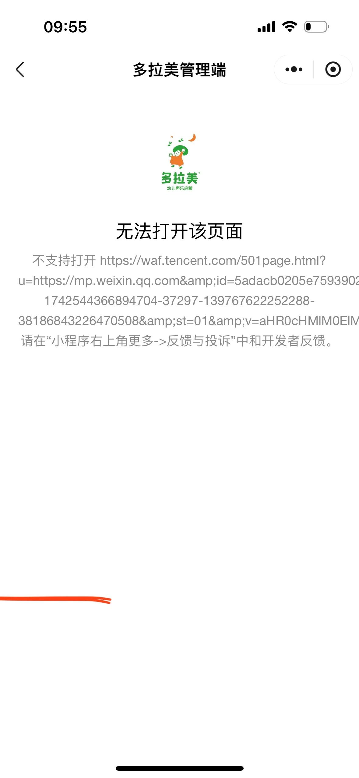 1.完整报错信息:无法打开该页面不支持打开 https://waf.tencent.com/501page.html?u=https://mp.weixin.qq.com&amp;id=5adacb0205e7593902e3778f715e0dda-1742544366894704-37297-139767622252288-38186843226470508&amp;st=01&amp;v=aHR0cHMlM0ElMkYlMkZtcC53ZWl4aW4ucXEuY29tJTJGbXAlMkZ3YWVycnBhZ2UlM0ZhcHBpZCUzRHd4YzI0NmM4NjRmZTk4MTg0ZiUyNmRvbWFpbiUzRGh0dHBzJTI1M0ElMjUyRiUyNTJGZXhhbXBsZS5jb20lMjZyZWFzb24lM0QyJTI2dHlwZSUzRGp1bXAyaDVlcnIlMjZlcnJvcl9yZXQlM0QyJTI2cGFnZV91cmwlM0RodHRwcyUyNTNBJTI1MkYlMjUyRmV4YW1wbGUuY29tJTI1MkYlMjUyM3dlY2hhdF9yZWRpcmVjdCUyNmRldmljZXR5cGUlM0RpT1MxNy4wJTI2dmVyc2lvbiUzRDE4MDAzZjI4JTI2bGFuZyUzRHpoX0NOJTI2bmV0dHlwZSUzRFdJRkklMjZhc2NlbmUlM0Q0OSUyNnBhc3NfdGlja2V0JTNENFRZQjFMMDF2VFVQczVJZTdZZzVwSlFwNURZJTI1MkJpUDRlWlMwMldEJTI1MkZwRDhIWTgxYklLcXpUbGVJNGZjUyUyNTJGODNDRCUyNnd4X2hlYWRlciUzRDM=,请在“小程序右上角更多->反馈与投诉”中和开发者反馈。