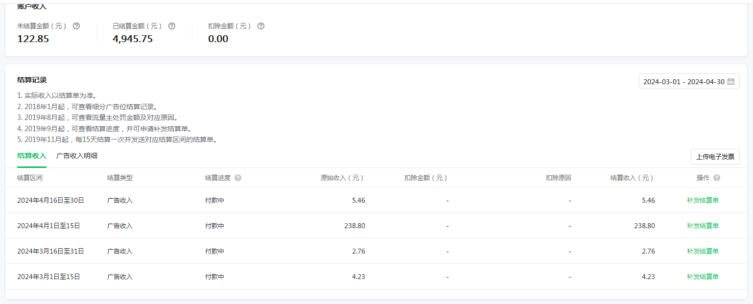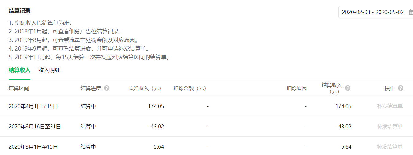 温馨提示:流量主结算及付款是按结算主体的,结算单包含了同一收款主体在微信开通的全部流量主账号在当月应获取的广告收入。