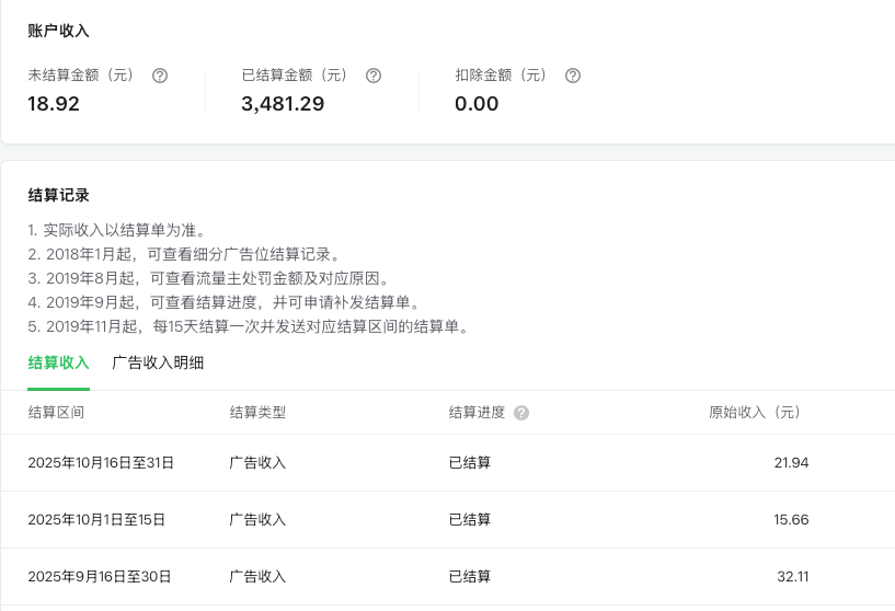 温馨提示:流量主结算及付款是按结算主体的,结算单包含了同一收款主体在微信开通的全部流量主账号在当月应获取的广告收入。