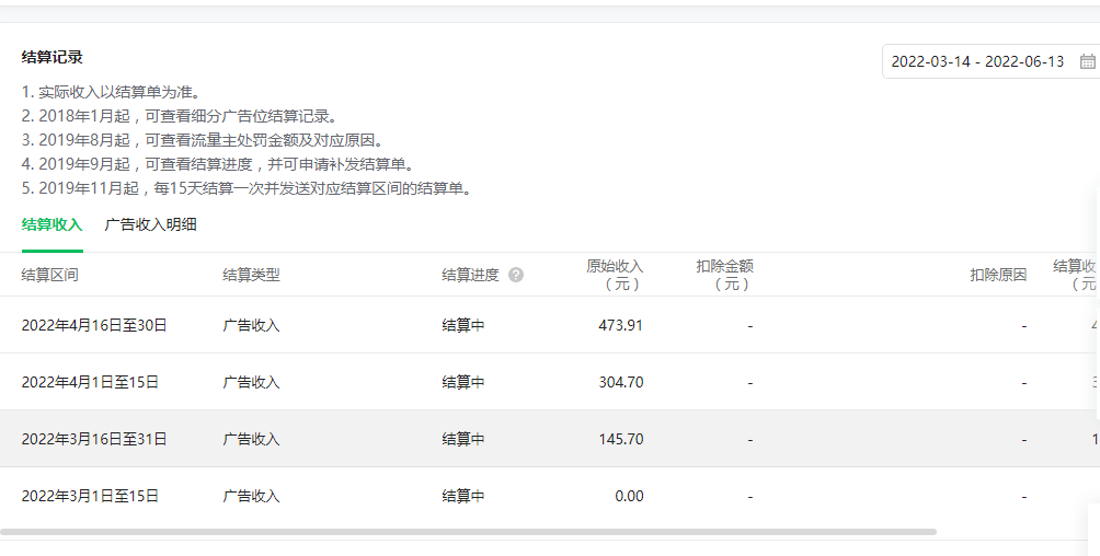 温馨提示:流量主结算及付款是按结算主体的,结算单包含了同一收款主体在微信开通的全部流量主账号在当月应获取的广告收入。