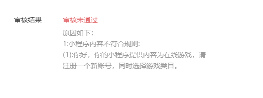 你好,经核实,贵方小程序提供内容为在线游戏,请注册一个新账号,同时选择游戏类目