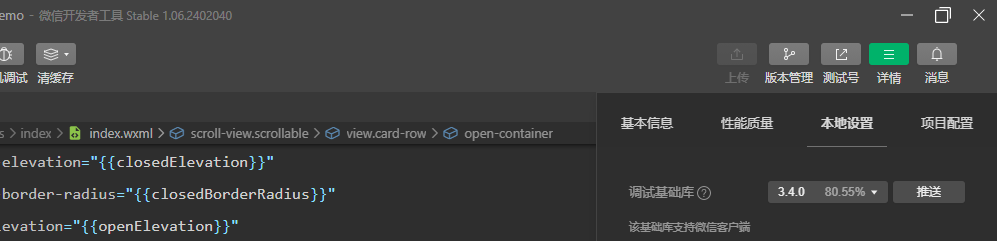 我尝试过直接修改project.config.json中的libversion 发现不生效,因为官方示例中的open-container在预览模式与开发工具上都不生效,该示例需要3.4.0的基础库版本