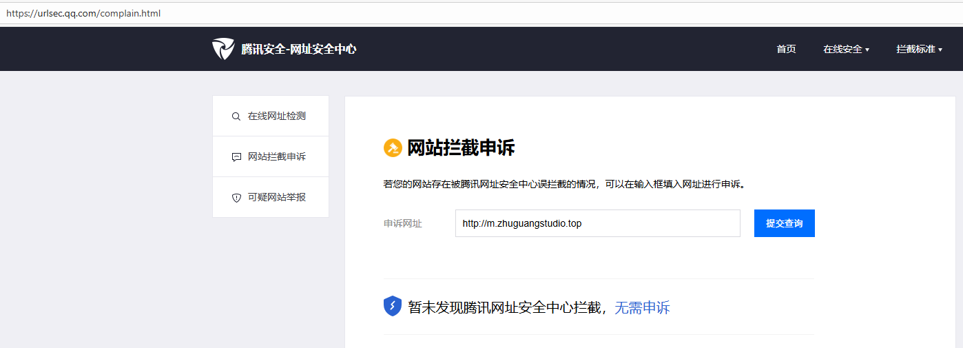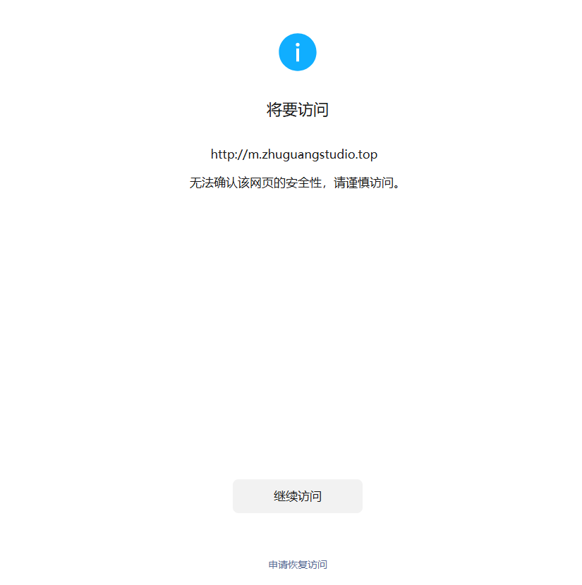 我的服务号网页http://m.zhuguangstudio.top,在微信中打开提示"无法确认该网页的安全性,请谨慎访问"。域名备案正常,浏览器访问正常,网页里没有不安全的内容,腾讯安全-网址安全中心检测也没有发现风险,请核实后帮忙解除拦截,谢谢!另外为什么会出现这种情况,请帮忙查一下,万分感谢!