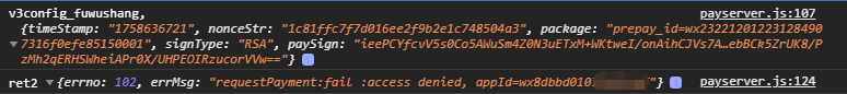中出现了 {"errno":102,"errMsg":"requestPayment:fail :access denied, appId=wx8dbb765475469fsf"} 这个报错,