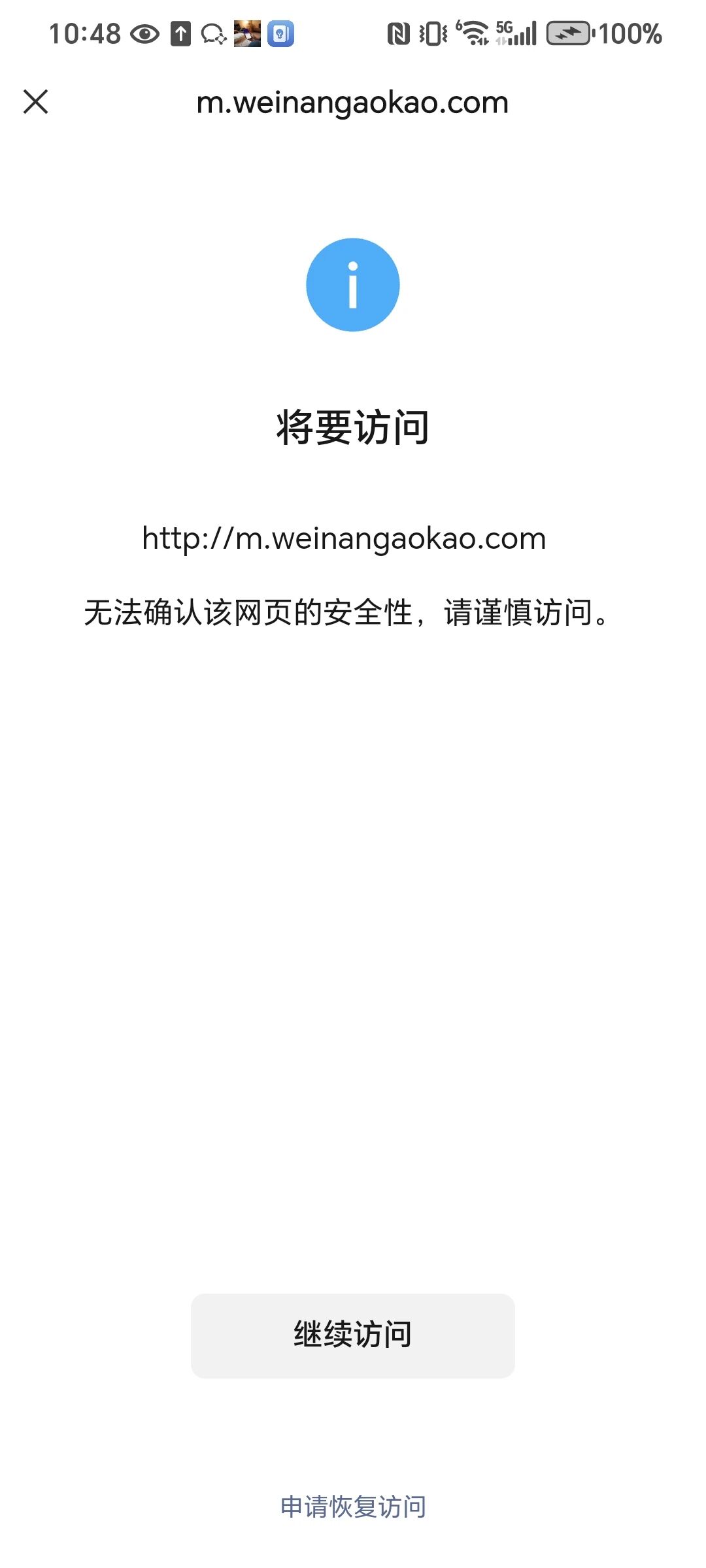 您好,域名weinangaokao.com在西部数码注册并通过Ucloud备案通过,浏览器访问正常,我是网站开发者,访问时间如图2025/5/21,微信识别二维码,访问网站出现“无法确认该网站的安全性。”经检查网页里没有不安全的内容,请核实后帮忙解除拦截,谢谢!