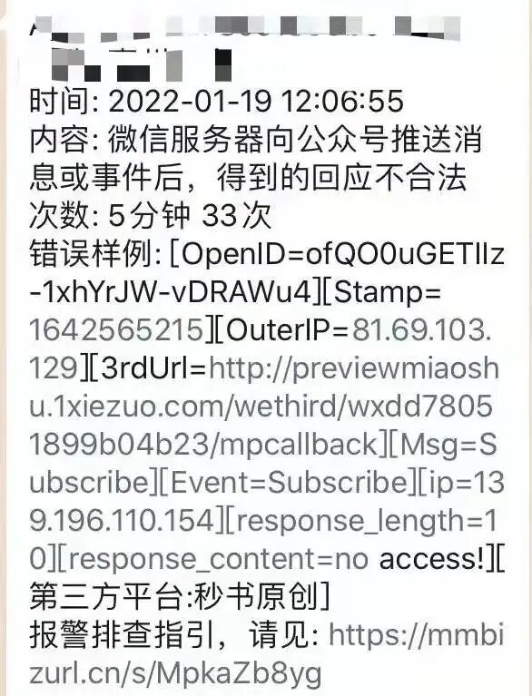 你好,请联系授权的第三方平台参考文档https://developers.weixin.qq.com/doc/offiaccount/Basic_Information/Warning_Message_Troubleshooting_Guide.html处理下消息哦~