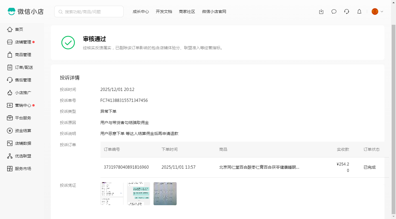 然后我申请投诉的结果也是证实了这两单确实是用户和达人联合恶意白嫖商家佣金的,而我得到的平台结果却是这样。经核实反馈属实,已剔除该订单影响的包含店铺体验分、联盟准入等经营指标。后续也没有专员跟进处理,就一个投诉结果,佣金也没有帮我们商家追回,平台手续也是没有退回。