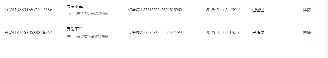 在11月份开始就有一些用户和达人一起联合恶意下单,一般金额比较大,而且地址不详细,电话不用。如果不检查确认就发货,快递会显示异常原路返回。这个时候就是最关键的时候了。这个订单快递退回,用户不退单商家又处理不了,可是佣金是待结算状态的。用户可以等到达人结算佣金后再申请退款,而且理由是没有收到商品原理退回,商家不得不退款给用户。但是给达人的佣金又是从我们商家这边抵扣的。
