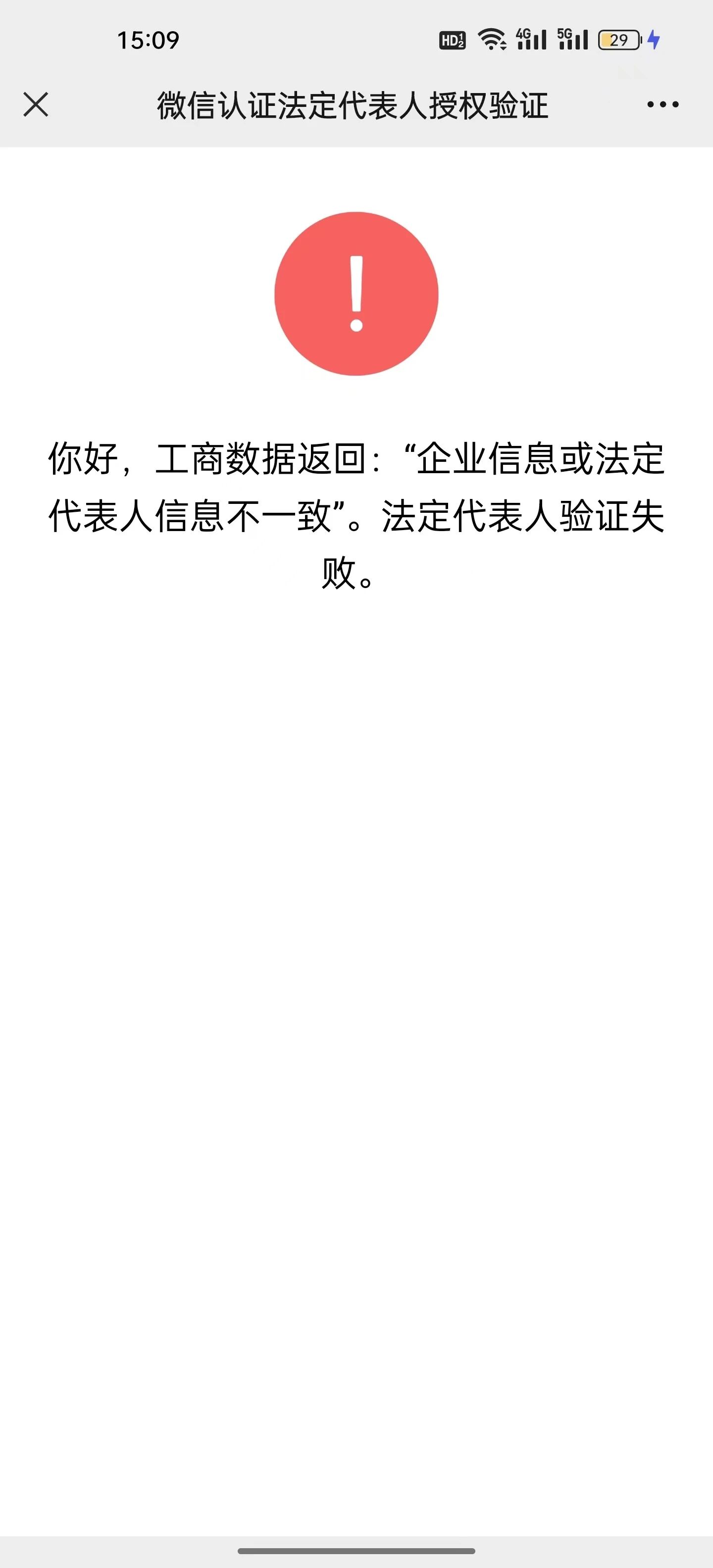 国家企业信用信息公示系统内可以查询到,公众号认证一直提示企业信息或法定代表人信息不一致,麻烦看下