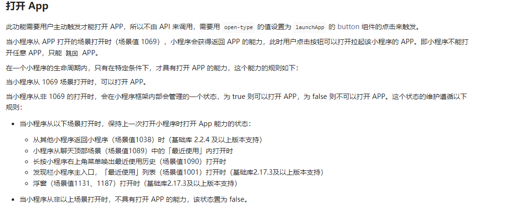 操作按钮:<button open-type="launchApp" app-parameter="{{ code }}" binderror="launchAppError" wx:else>返回医生工作台APP</button>