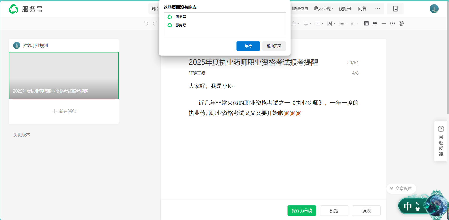浏览器登录微信公众平台后编写新文章老是提示这些页面没有响应,导致无法正常编写!
