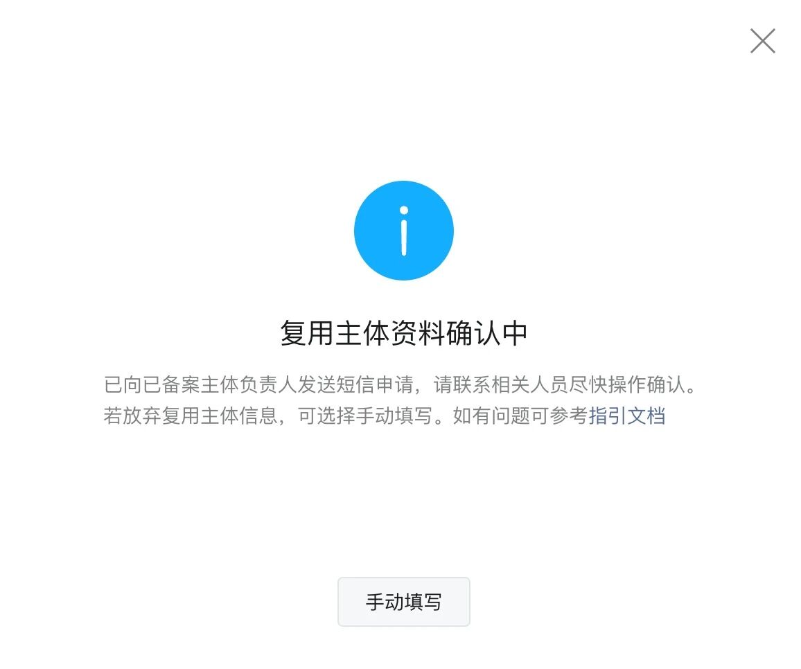 你好,点击“复用资料”按钮后,平台会向同主体下最新通过备案的小程序主体负责人,发送复用主体资料的确认短信。请自行核实。若需中途放弃复用,也可以选择“手动填写”。
