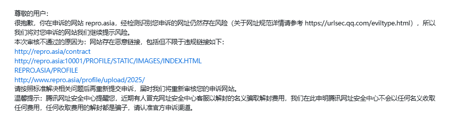 你好,经审核,域名【repro.asia】下的链接【https://www.repro.asia:10001/profile/upload/2025/05/22/2_20250522202254A099.html?token=aHZwdnswIyF4d3J0YWl4bw5BRUtEUkEAU1wbQkhLRgw2J2sEAg41eWQKAgJ3a2tqWFBQVV9dXVlJS1oeDBcQ】等链接的内容存在违反《微信外部链接内容管理规范》的第10条“低俗色情类内容”,请排查并把域名下相关违规内容修改并修复安全漏洞后进行申诉;申诉方式可点击停止访问页底部入口进行操作,我们会在三个工作日处理,请耐心等待。 详细规则请参考《微信外部链接内容管理规范》http://weixin.qq.com/cgi-bin/readtemplate?t=weixin_external_links_content_management_specification"