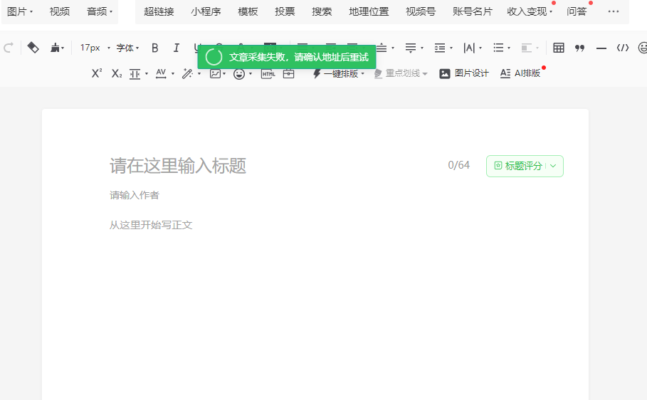 无法采集其他公众号文章,复制连接后显示文章采集失败,请确认地址后重试。