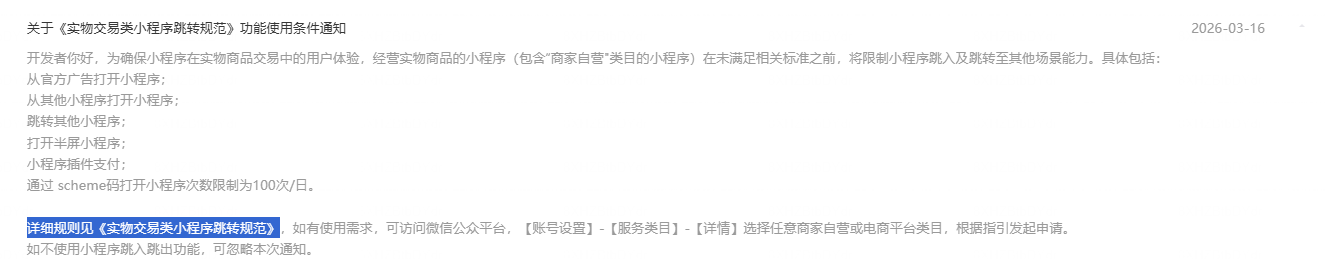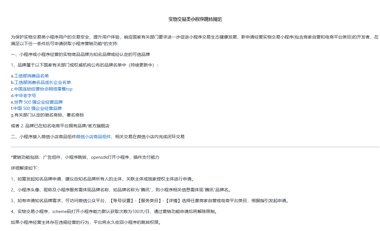 你好,为保护实物交易类小程序用户的交易安全、提升用户体验,响应国家有关部门要求进一步促进小程序电商生态健康发展,经营实物交易小程序(包含商家自营和电商平台类目)的开发者,在满足相关条件后可申请获取小程序营销功能,否则将不开放相应能力。