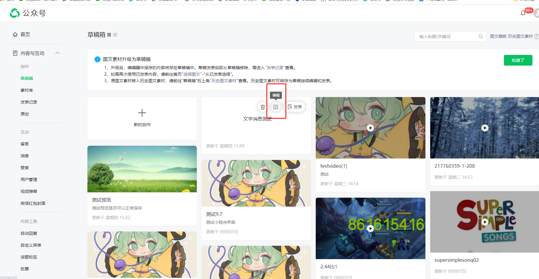 之前的图文素材,现在升级成草稿箱了,在历史图文素材里的图文居然不能再次编辑。