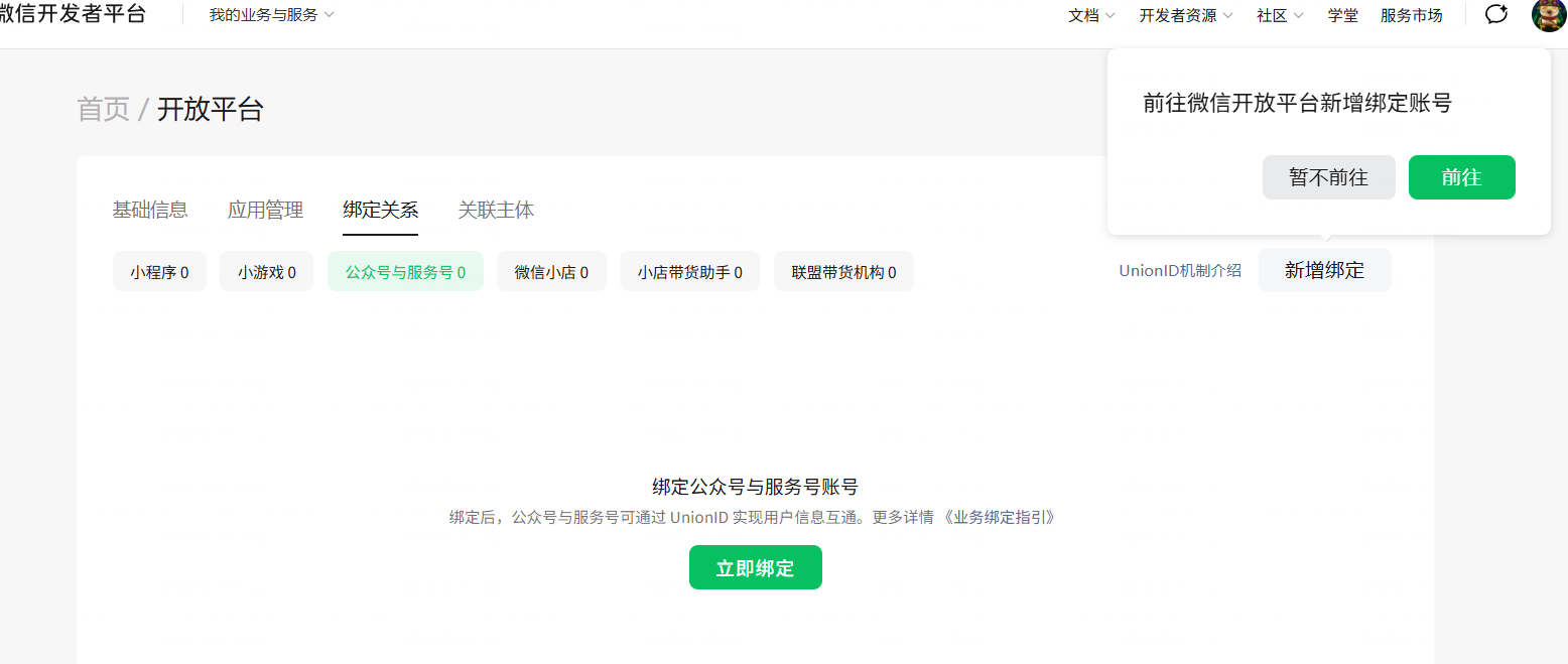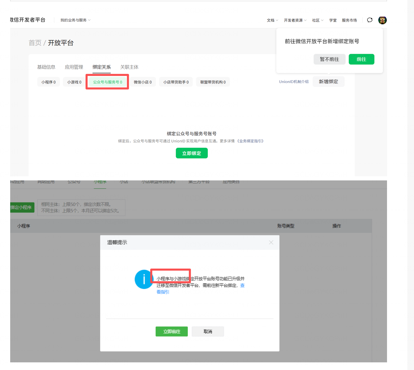 2,公众号与服务号绑定open账号,在开放平台(后续也会迁移到开发者平台)