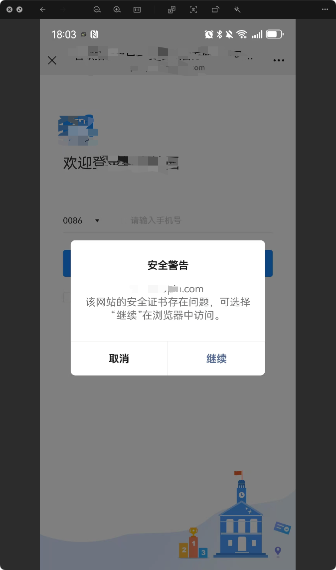 安卓端微信升级到8.0.62版本后,访问公众号网页,在微信浏览器中打开网站地址的时候,提示安全警告:“该网站的安全证书存在问题,可选择“继续”在浏览器中访问。”
