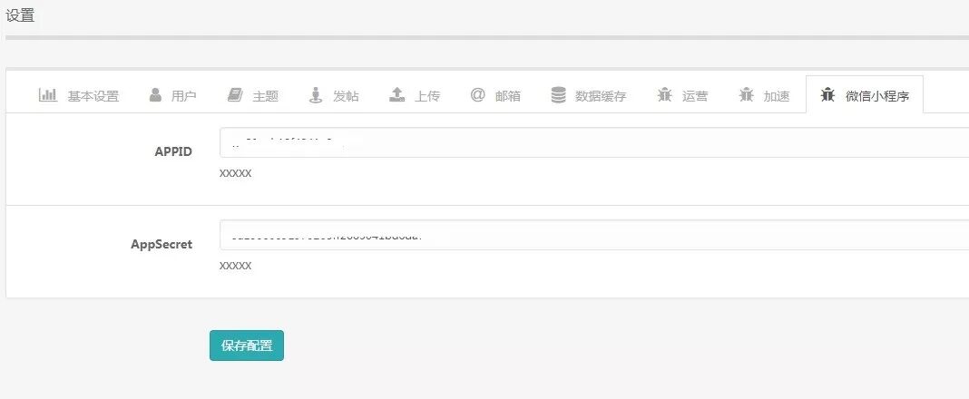 点击微信小程序,填写APPID与APPsercret点击【保存配置】