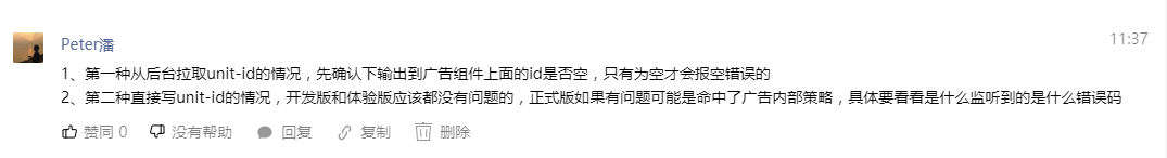 2、第二种直接写unit-id的情况,开发版和体验版应该都没有问题的,正式版如果有问题可能是命中了广告内部策略,具体要看看是什么监听到的是什么错误码