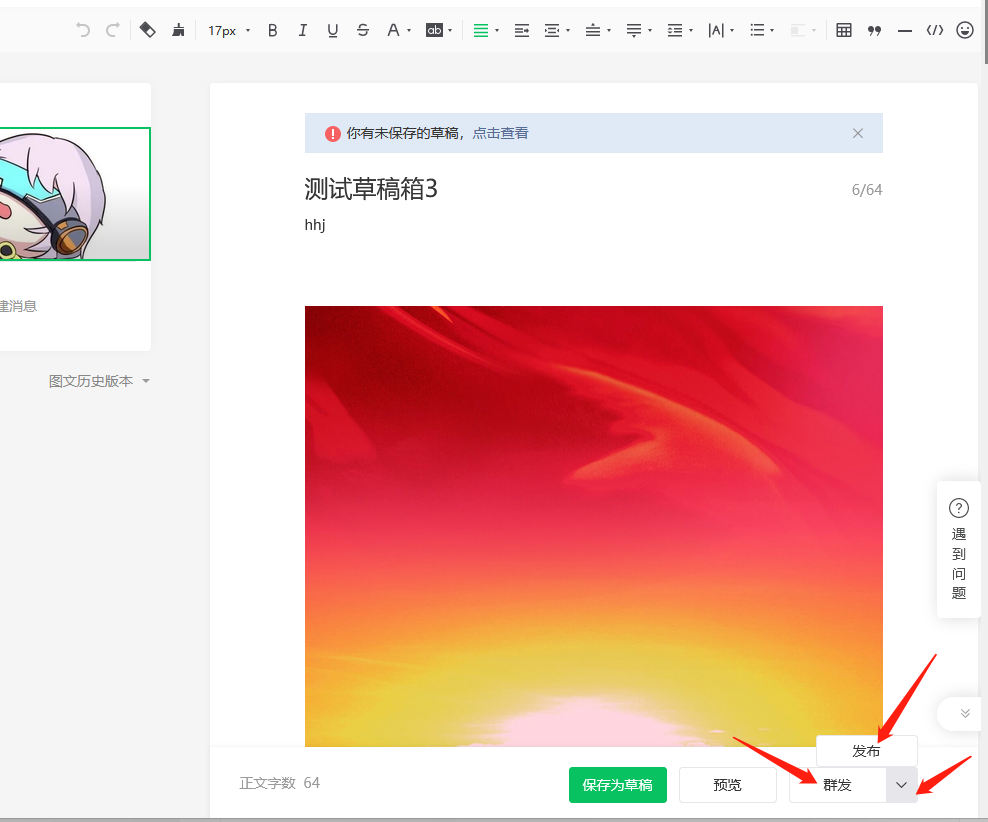 公众号将 素材图文 升级为 草稿箱后,多出了一个“发布”的动作,有别于群发,发布是静默的,订阅用户是接受不到的,而且没有次数限制,群发就还是以前的形式,每天一次的群发次数。