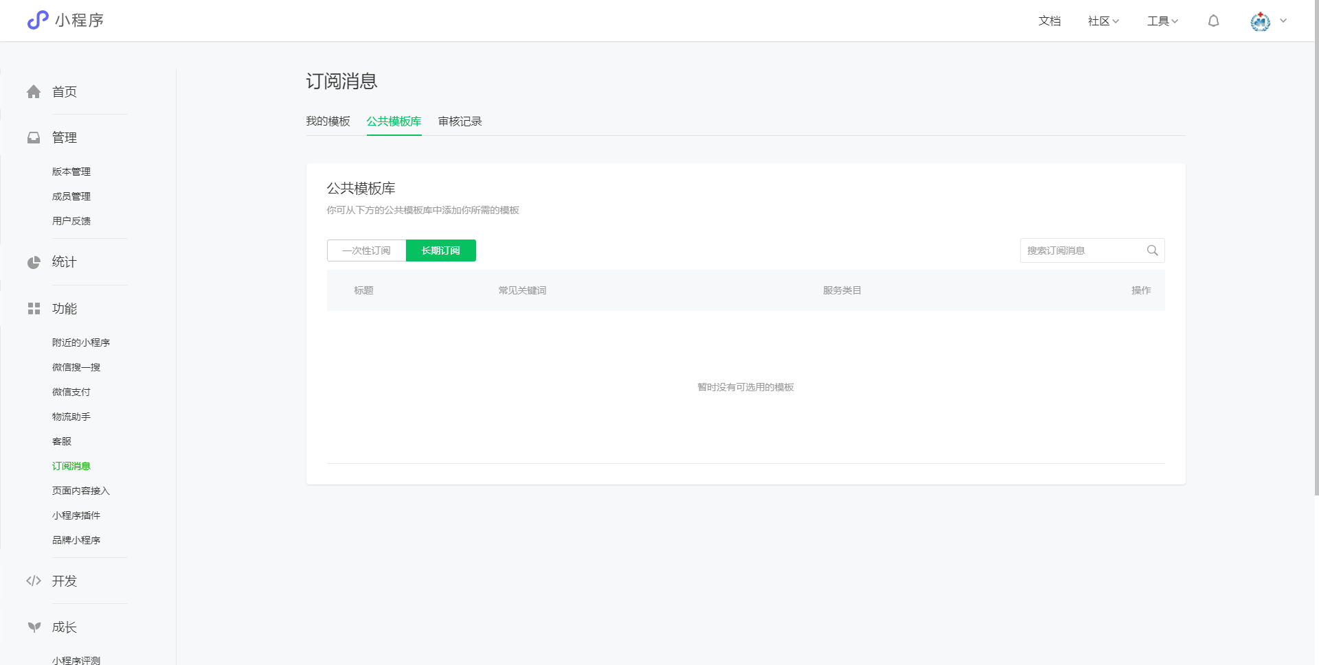 小程序appid为wx98b3dae575f1acd2,目前长期订阅并无模板可用