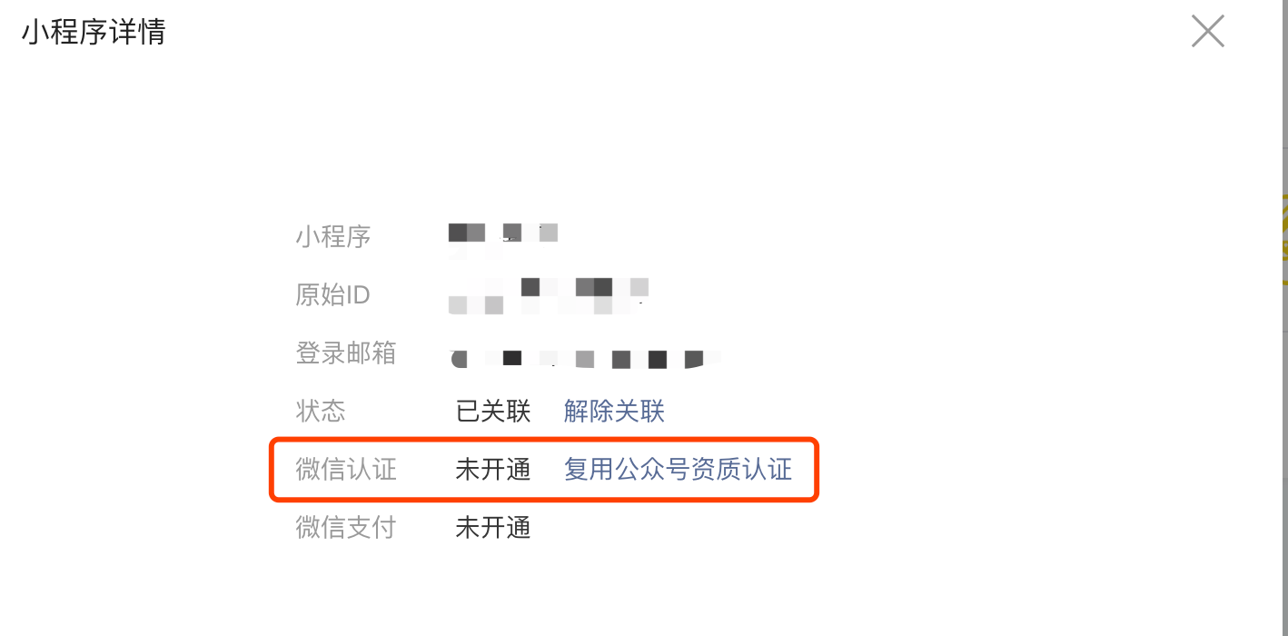 之后公众号完成认证了,并已与小程序关联,再到小程序后台想要认证,小程序还要我重复填一次公众号认证的资料,没有复用资料按钮