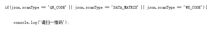 wx.scanCode({ onlyFromCamera: true, scanType: ['barCode'], success: function(json) { if(json.scanType == 'QR_CODE' || json.scanType == 'DATA_MATRIX' || json.scanType == 'WX_CODE'){ console.log('请扫一维码'); }else if (!!json.result) { // 扫码成功 console.logt('成功'); } else { console.log('扫码失败'); } } }); |