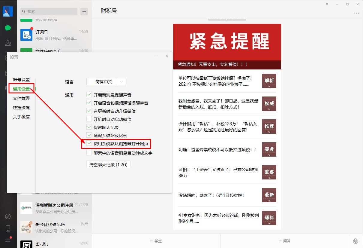 学着百度的经验上有人提出去微信设置里面勾选了“使用系统默认浏览器打开网页”后,勉强可以打开看到文章的内容,也只是单篇文章的内容