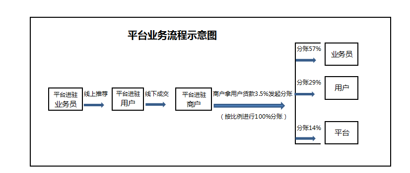 用户在商户店里成交后,用户是将货款“线下”给商户的,没有在平台上体现出来。用户在成交后只是在平台提交一个交易记录比如在商户那里成交了1000元(提交给平台的只是交易记录、不涉及到支付),商户点击确认后就微信支付35元(用户货款的3.5%)进行分账给业务员、用户、平台,这个35元是要100%分出去的,这里涉及到100%比例分账。