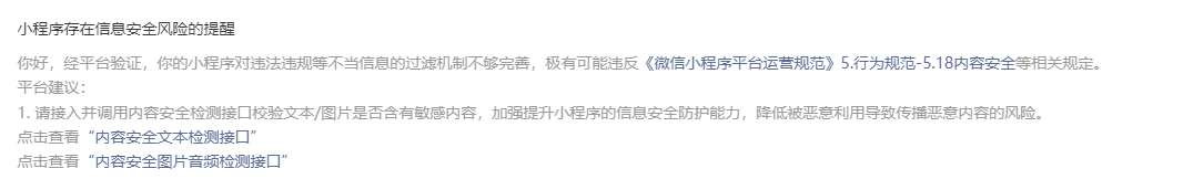 这不是提示了,你的小程序功能里提交内容需要进行内容安全校验,上传图片和音频需要进行内容安全图片音频检测