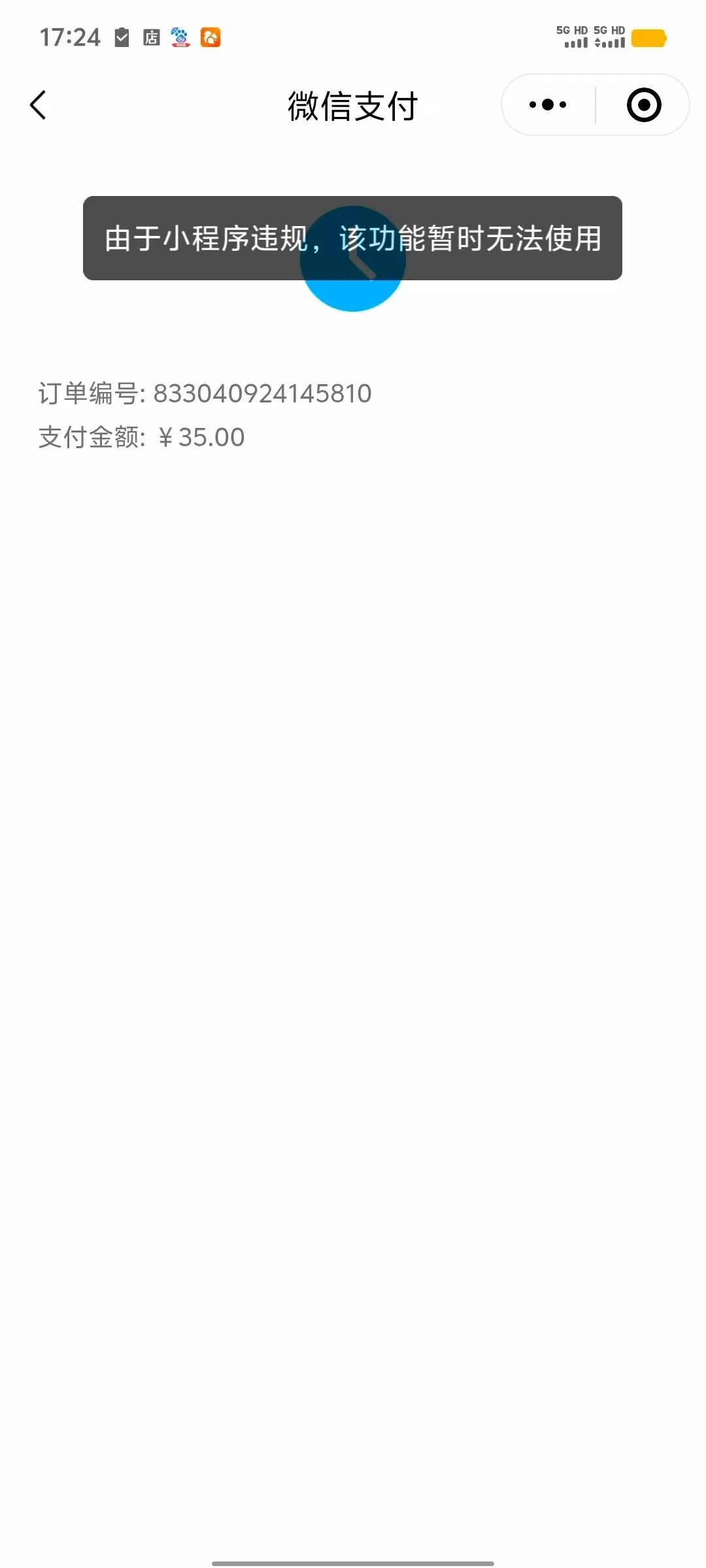 创建了企业小程序,货物正常上架后,现做试运行,选择微信支付,提示小程序违规,该功能暂时无法使用,。