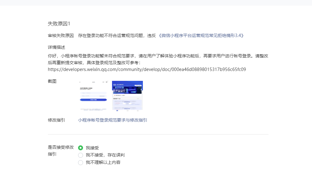 建议去除首页即需授权登录/注册功能,在用户需要体验小程序具体功能时,再要求用户进行帐号登录。且在帐号登录环节,应当为用户提供可取消或拒绝的选项按钮。具体登录规范及整改可参考:https://developers.weixin.qq.com/community/develop/doc/000ea46d08898015317b956c65fc09